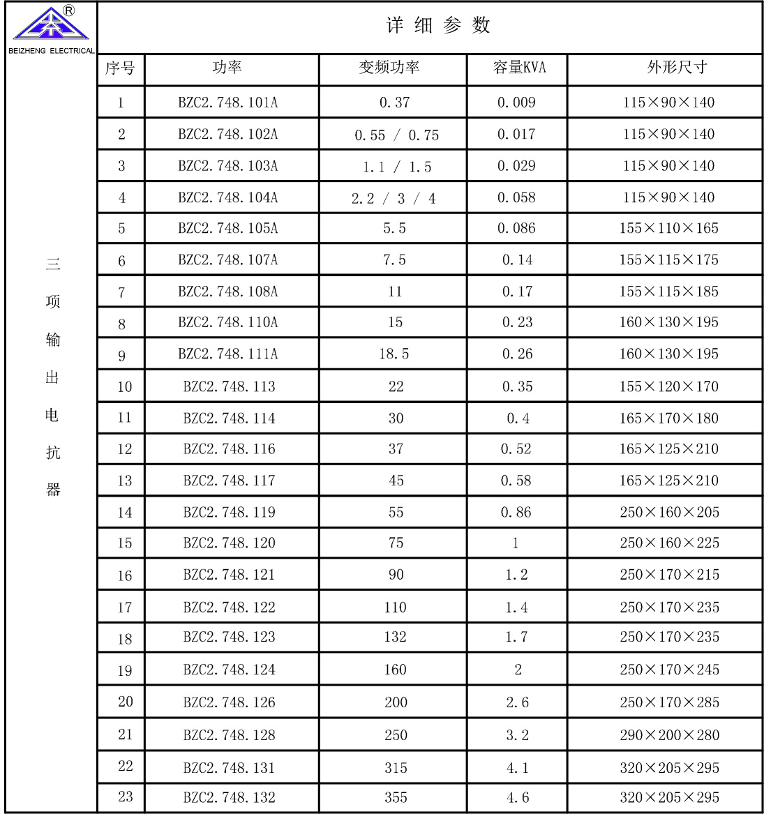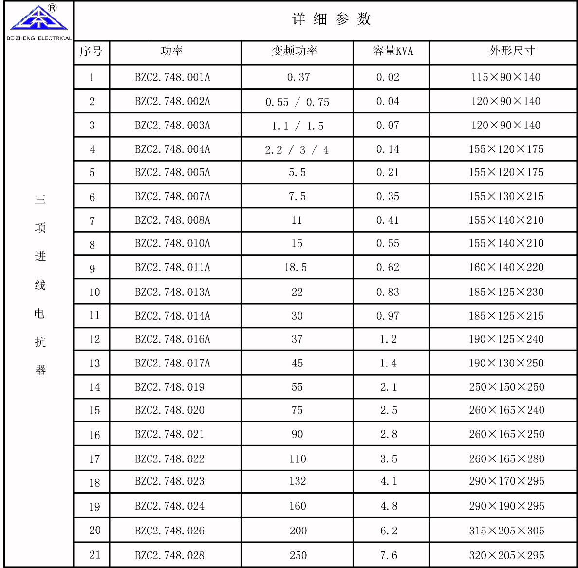 進(jìn)線/輸出電抗器選型表